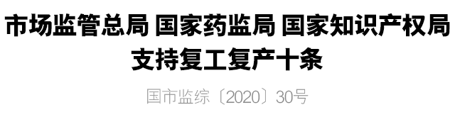 各省、自治区、直辖市及计划单列市、副省级城市、新疆生产建设兵团市场监管局(厅、委)、药监局、知识产权局: 为贯彻落实习近平总书记重要讲话和指示批示精神,按照党中央、国务院关于切实加强疫情科学防控、有序做好企业复工复产工作的部署,现就充分发挥职能作用,解决企业复工复产中面临的实际问题,提出十条政策措施。 1.登记网上办理 充分依托“网上办、掌上办、寄递办、预约办”等有效手段,进一步压减登记注册环节、时间和成本,对生产防疫用品的企业登记注册实行特事特办。对于疫情期间出现的新产业新业态,及时调整经营范围标准。 2.实行告知承诺 对凡涉及生产许可证、强制性认证的复产转产企业产品,快捷办理,压缩审批时限。对具备生产条件但因办理耗时长、暂不能提交相应材料的企业实行告知承诺制,由企业承诺在相应时限内补充提交相关材料后当场给予办结。 在保障食品安全的前提下,简化食品生产、经营许可流程,推进网上办理,推广食品经营许可电子证书的发放。对于申请许可的新办企业、申请许可变更的企业,需要现场核查的,由省级市场监管部门依据本地区食品安全风险分级情况,对低风险食品试点开展告知承诺,对符合条件的实施“先证后查”。 检验检测机构资质认定,全面实行网上办理、邮寄办理,采取延期评审、告知承诺、远程监控评审、专家文审等方式进行。 便利企业并购交易,经营者集中反垄断审查实行网上申报,提高简易案件审查效率,保障企业并购交易顺利进行。优化经营者集中反垄断审查工作机制,加强企业竞争合规指导和服务。 3.建立行政许可应急绿色通道 对生产企业转产生产口罩、防护服等应急物资的,简化生产资质审批程序,合并产品注册及生产许可证检查流程,启动加急检验检测程序,同时认可企业的部分自检报告。对符合许可条件的企业现场确认后,立即办理产品注册和发给生产许可证。对于转产生产医疗器械的企业,实行应急审批,依法办理医疗器械注册证和生产许可证。 对疫情防控所需药品的注册申请,在确保安全性和有效性的基础上,加快审评审批。对疫情防控所需的药品,各省级药品监管部门要指导企业合理安排生产,充分释放产能,全力保障临床供应。对医用口罩、防护服等医疗器械产品注册、生产许可和检验检测等实施特别措施,合并审批流程。 对涉及防治新冠肺炎的专利申请、商标注册,依请求予以优先审查办理。支持企业开展知识产权质押融资,建立知识产权质押登记绿色通道,支持企业快速融资和续贷,缓解资金困难。 4.延长行政许可期限 对在疫情防控期间营业执照登记事项发生变化又不能及时办理变更登记的,延期至疫情解除之后一个月内办理。 对因疫情影响未能按时办理工业产品生产许可证换证导致许可证书过期的生产企业,可办理许可证延期,待疫情解除后再行提交延期申请。 对食品生产、经营许可证到期的,有效期可顺延至当地疫情解除。 对因疫情影响不能按时完成换证的特种设备生产单位及检验检测机构,可办理许可证延期。鼓励符合条件的特种设备生产单位,采用自我声明承诺的方式免评审换证。 对受疫情影响无法按期申请办理检验检测机构复查换证的,可以延期至疫情解除后办理,证书有效期延长至疫情解除后三个月。 对复工复产企业办理专利、商标、集成电路布图设计等事务,因受疫情影响超出相关期限的,依法给予期限中止、顺延,以及请求恢复权利等便利化救济政策措施。 5.加快标准转换应用 支持外贸出口企业复产,加快国际标准与国内标准的转换,推动出口产品依据标准和国内标准的衔接。对依据国际标准生产,且相关国际标准主要技术指标达到强制性国家标准安全要求的,允许在国内生产销售。鼓励社会团体组织制定相关团体标准,增加企业复工复产所需标准的有效供给。对于生产国外标准口罩用于出口、有能力生产国内标准口罩未取得相关资质的企业,加快办理。 6.审慎异常名录管理 对生产、经营疫情防控相关物资的企业,已被列入经营异常名录的,经企业申请,可以简化流程、尽快移出。对因受疫情影响暂时失联的企业,可以暂不列入经营异常名录。 7.严查乱收费乱涨价 加强价格监管,严查各类涉及企业的乱收费行为,减轻企业复工复产负担。支持企业增加产能,严厉打击口罩等防控物资生产领域哄抬价格等违法行为,维护防控物资生产所需机器设备、原辅材料市场价格秩序稳定。 8.加强质量技术服务帮扶 实行计量型式评价专人受理,缩短试验时间。对到期的有关计量标准器具,经所在单位自行核查满足相关技术要求,可适当延长有效期。 鼓励标准化技术组织和机构,围绕企业复工复产提供标准化咨询等标准技术服务。帮助企业尽快建立可操作的防疫质量控制流程和规范,实现防疫控制与企业复工的精细化管理。启动物品编码业务24小时快速响应机制。 引导认证机构加强对复工复产企业的技术服务,开辟线上咨询、受理、评价等综合服务通道,采取线上认证申请受理、延期现场审核检查、优先安排3C认证等方式进行办理。 9.减免技术服务收费 疫情防控期间,市场监管总局所属的计量检定机构、产品质量检验检测机构、特种设备检验检测机构,对复工复产企业计量器具的检定校准收费、产品质量检验检测项目收费、特种设备