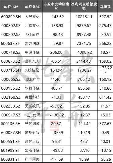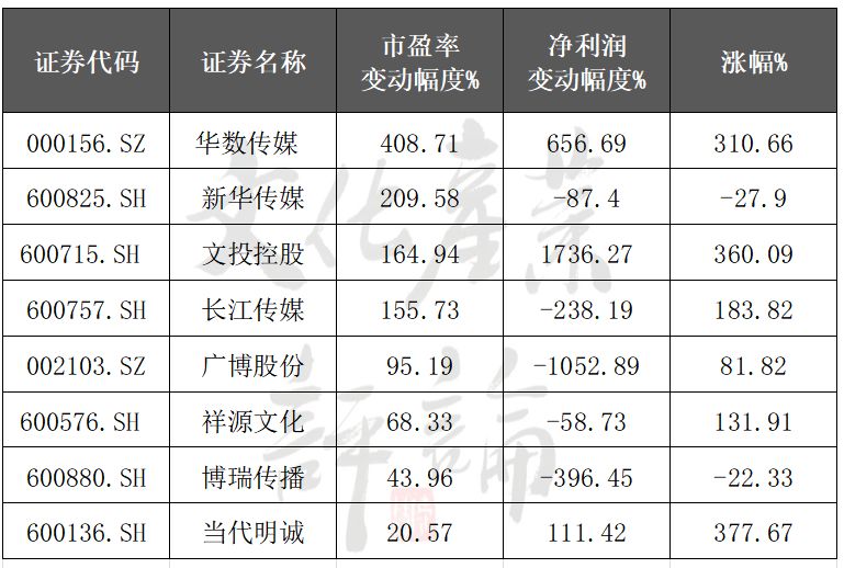 其中,华数传媒、文投控股、当代名诚实现了利润和估值的双提升,实现了戴维斯双击。其他几家,则利润下降,涨幅全靠估值提升来推动的,比如长江传媒、广博股份、祥源文化。